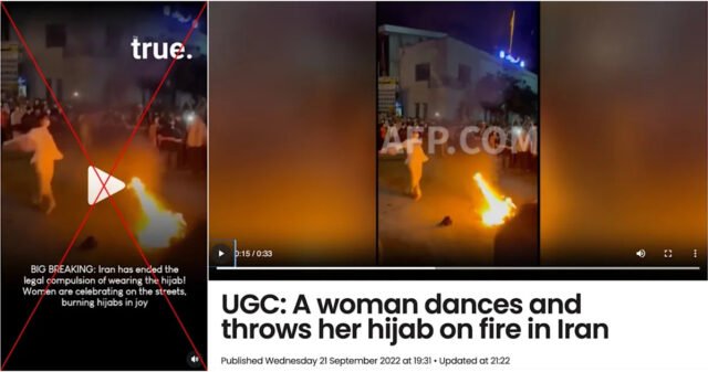 Como la gente se apresuró a En las calles durante las protestas masivas en Irán, se compartió un video de una mujer bailando y arrojando su pañuelo a una hoguera en publicaciones que afirmaban falsamente que mostraba a personas celebrando el fin del mandato del hijab en la república islámica. Si bien analistas y activistas dicen que las autoridades han suavizado la imposición del uso obligatorio del hijab en la vida diaria, Irán no ha abandonado el requisito. En realidad, las imágenes se grabaron en 2022 durante una protesta anterior tras la muerte de una mujer que murió bajo custodia policial tras ser arrestada por no llevar correctamente el hijab.