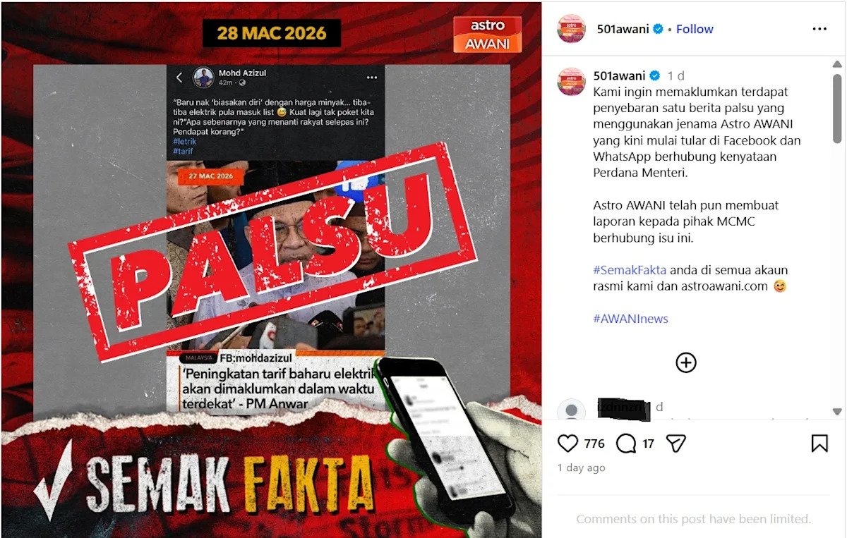 Captura de pantalla de la declaración de Astro Awani en Instagram