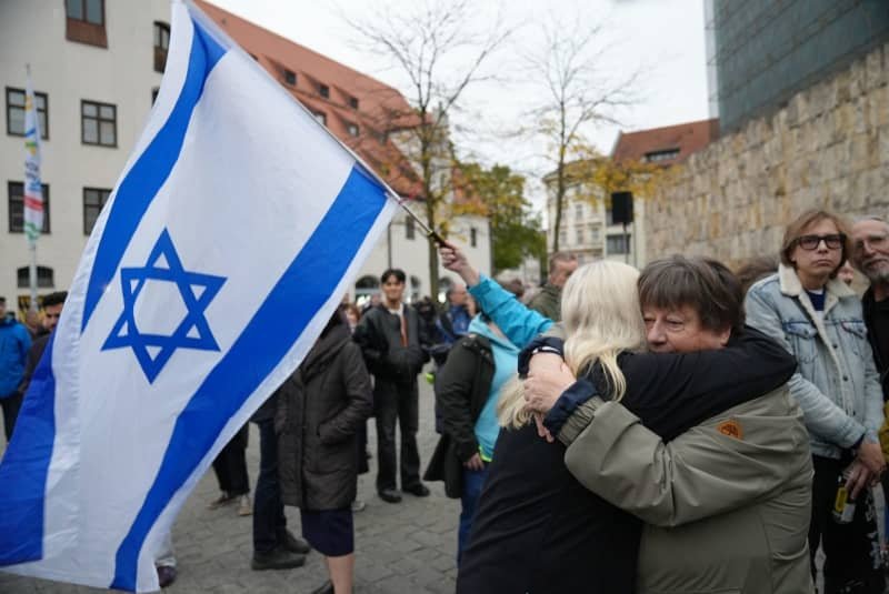 Unas 300 personas asistieron a la manifestación en Munich bajo el lema “¡Bailaremos de nuevo!”. en la sinagoga de esta ciudad del sur de Alemania. Muchos participantes portaban banderas israelíes y algunos se abrazaron.