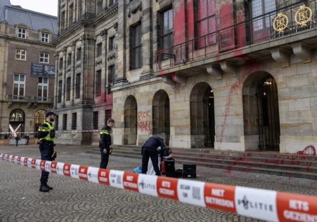 Los activistas hicieron una pintura roja en el Palacio Real de Amsterdam en el centro de la capital holandesa y escribieron “Fuck Israel” antes del amanecer el martes para conmemorar el segundo aniversario de los ataques de Hamas montados de la Franja de Gaza.