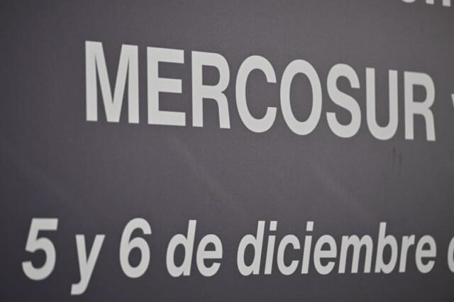 El logo del Mercosur es visible al margen de la cumbre de la alianza económica. Santiago Mazzarovich/dpa