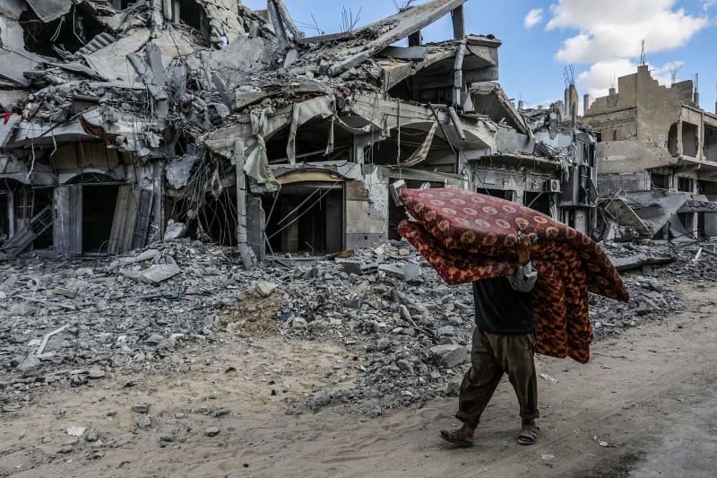 La gente pasa junto a edificios destruidos mientras los palestinos desplazados regresan a sus hogares después de que el ejército israelí se retirara de algunas zonas al este de Khan Yunis, en el sur de la Franja de Gaza, tras el anuncio de un acuerdo entre Israel y Hamas palestino sobre la implementación de la primera fase del plan de paz estadounidense para la Franja de Gaza. Abed Rahim Khatib/dpa