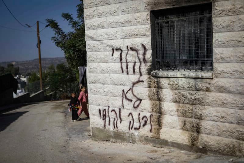 PALESTINOS INSPECCIONAN un vehículo quemado durante un ataque de colonos extremistas en la aldea de Jaba, en Cisjordania, el 18 de noviembre de 2025. (crédito: WISAM HASHLAMOUN/FLASH90)