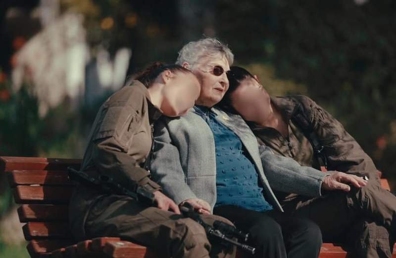 Sarah Weinstein, sobreviviente del Holocausto de 96 años, se reunió con dos mujeres soldados de las FDI de la Brigada de Rescate y Evacuación del Comando del Frente Interior (crédito: UNIDAD DE PORTAVOZ DE LAS FDI)