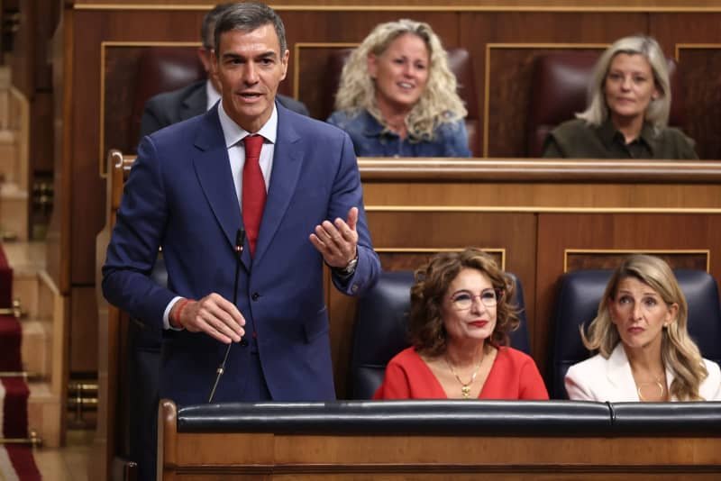 El presidente del Gobierno español, Pedro Sánchez, habla durante el turno de preguntas del Gobierno español en la Cámara Baja de Madrid. El Congreso de los Diputados vota hoy el embargo de armas contra Israel, después de haberlo debatido ayer por la tarde en el Pleno. Eduardo Parra/EUROPA PRESS/dpa