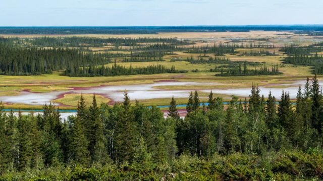 El paisaje del Parque Nacional Wood Buffalo se caracteriza por salinas y bosques boreales, y el parque alberga el el delta interior más grande del mundoen la confluencia de los ríos Athabasca y Peace. Disfrute de oportunidades de senderismo y piragüismo en todo el parque, disfrutando de vistas espectaculares a lo largo del camino. También es el la reserva de cielo oscuro más grande del mundopor eso observar las estrellas es popular aquí.