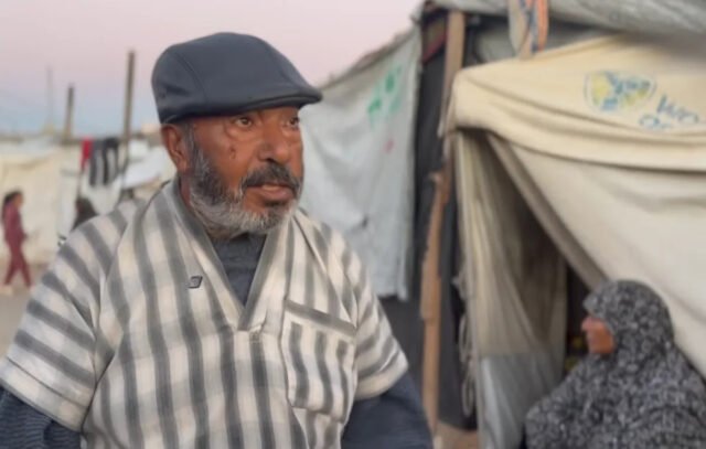 Naif Musbah, de 68 años, que vive en el campo de refugiados de Nuseirat, sufre de cáncer de colon y los suministros que necesita para el tratamiento no están disponibles.