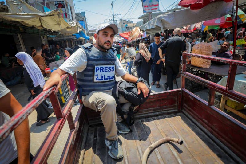 Periodistas palestinos informan sobre la guerra en curso y la crisis humanitaria en el centro de la Franja de Gaza, 26 de julio de 2025. (Ali Hassan/Flash90)