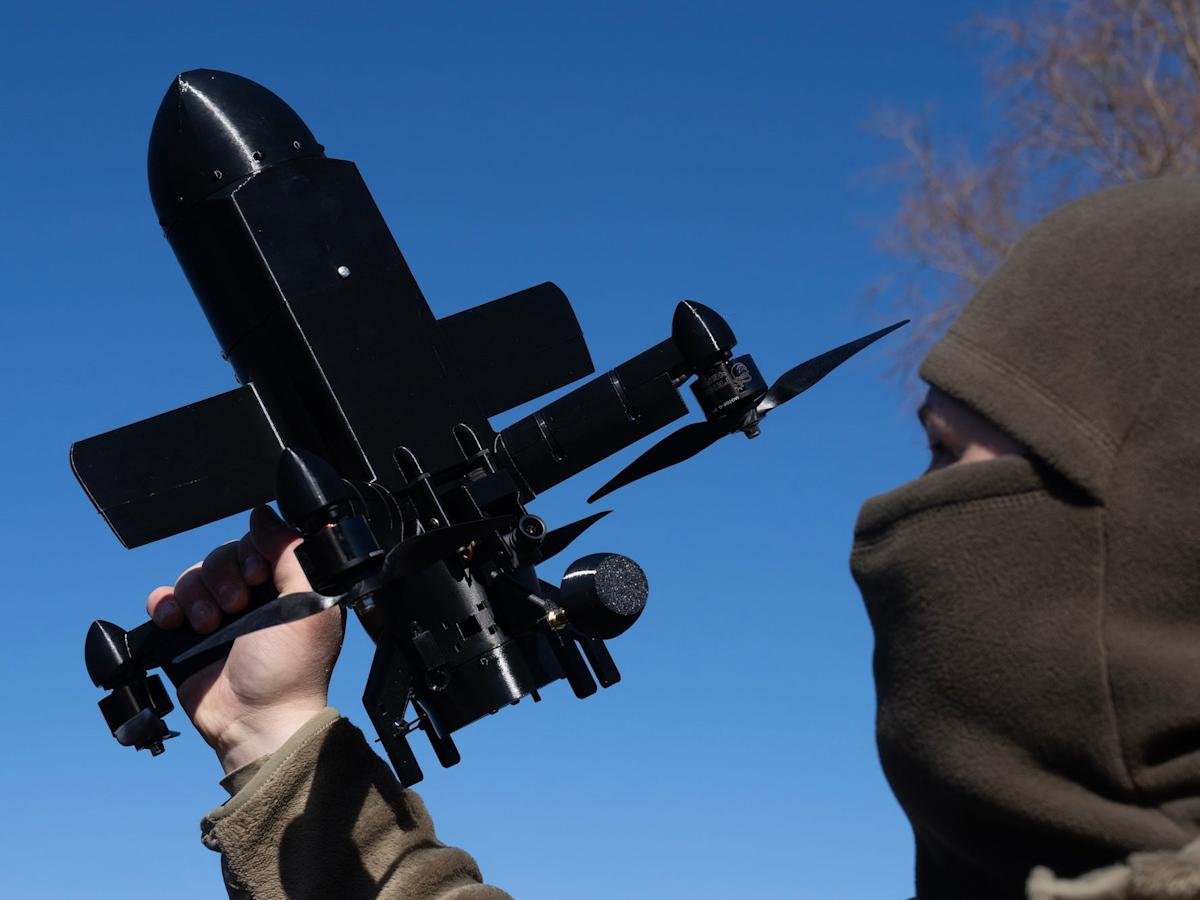 Un soldado del grupo Khanter (Cazador) de la 208.ª Brigada de Misiles Antiaéreos Khersonska de Ucrania sostiene un dron interceptor.Nina Liashonok / Ukrinform/Future Publishing vía Getty Images