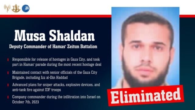 Shaldan, un comandante asistente del Batallón Zeitun en Hamas, participó en la masacre del 7 de octubre, así como para participar en elDesfiles de lanzamiento de rehenes Hamas se organizó a principios de este año.