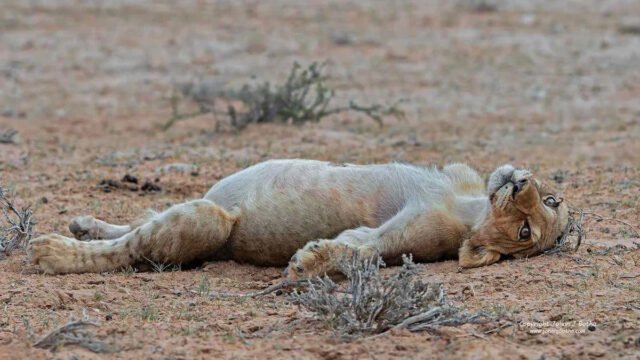 Pero quizás la foto más sorprendente y “humanamente desarmante” que obtuvo ese día fue la de un cachorro de león desplomado sobre su espalda, con el vientre lleno mirando al cielo, digiriendo su abundante comida durante el día caluroso. Parece que el pequeño león aprendió este comportamiento de sus mayores, ya que Botha también tomó una fotografía de un león macho adulto que exhibe el mismo comportamiento de coma alimentario.