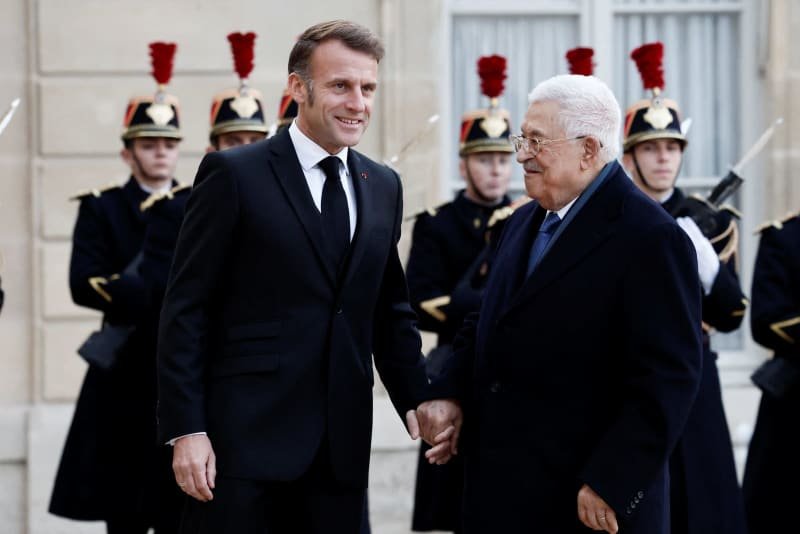 El presidente francés Emmanuel Macron da la bienvenida al presidente palestino Mahmoud Abbas en el Elíseo en París, Francia, el 11 de noviembre de 2025. (crédito: REUTERS/Benoit Tessier IMÁGENES TPX DEL DÍA)