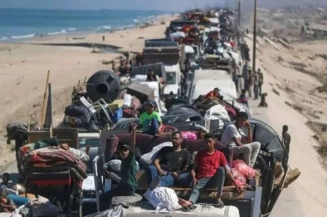 Un convoy de refugiados se alinea a lo largo de las carreteras de Gaza para huir del bombardeo israelí. Hasan Alzaanin / Tass a través de Zuma Press / DPA