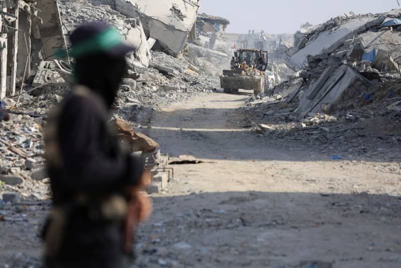 Trabajadores de Hamás y de la Cruz Roja buscan los cuerpos de rehenes israelíes fallecidos en Shajaiyah, Gaza. 4 de noviembre de 2025. (crédito: TPS-IL)