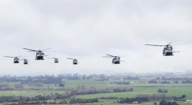 Wellington, Nueva Zelanda, dos helicópteros de la Royal New Zealand Air Force NH90 robó de Australia a Nueva Zelanda durante un viaje récord de dos días para el avión, que transportó dos tanques de combustible externos de 1.100 lb, según el servicio.