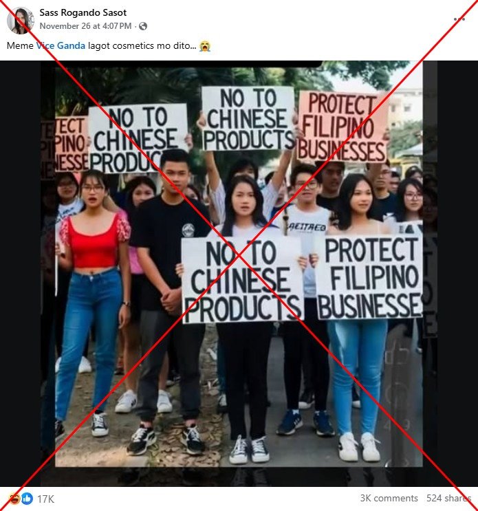 Las percepciones internas de China en Filipinas se han deteriorado debido al aumento de las tensiones por el conflicto del Mar de China Meridional, pero una imagen ampliamente compartida en las redes sociales que muestra a manifestantes pidiendo un boicot a los productos chinos es falsa. Está tomado de un video publicado en una página de redes sociales que comparte contenido generado por IA y contiene inconsistencias que a menudo se ven en imágenes fabricadas.