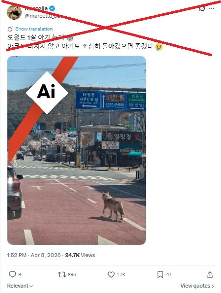 Sur Corea ha desplegado cientos de oficiales, drones y cámaras térmicas para buscar cada vez más a un lobo que escapó de un zoológico el 8 de abril de 2026. Horas después de la fuga, una imagen que supuestamente mostraba al fugitivo cruzando una intersección en la ciudad de Daejeon se difundió ampliamente en línea, amplificada por agencias gubernamentales y medios de comunicación. Sin embargo, un análisis visual de la AFP reveló que fue creado utilizando herramientas de inteligencia artificial (IA), conclusión respaldada por un experto local independiente. autoridades.