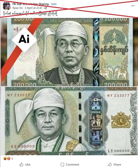 Después de que los legisladores promilitares de Myanmar eligieran al líder de la junta Min Aung Hlaing como presidente en abril, las publicaciones compartieron un billete generado por IA que representaba su rostro. No hay ningún informe oficial de que el banco central haya emitido nuevos billetes, mientras que las inconsistencias visuales y las herramientas de detección de IA indican que la imagen es falsa.