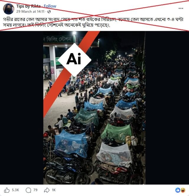 “Cientos de motocicletas hicieron cola cuando supieron que el combustible llegaría tarde por la noche. Pero muchos de ellos durmieron en la gasolinera cuando se anunció que tardarían otras tres o cuatro horas en conseguir el combustible”, se lee en bengalí. publicación en facebook compartido el 29 de marzo de 2026.