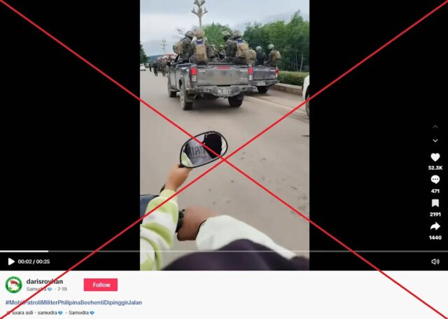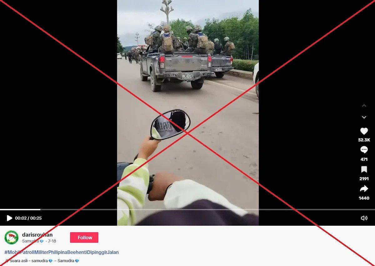 AFP por lo tanto Encontré un video similar de soldados condujo a la parte posterior de una camioneta compartida en Tiktok Desde el 18 de julio de 2025 con una leyenda indonesia que dice que muestra una “patrulla militar filipina”.