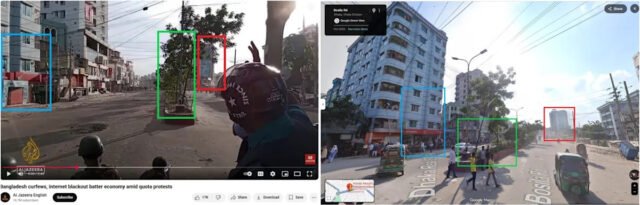 Comparación de la captura de pantalla del video Al Jazeera (L) y las imágenes de Street View de Google Maps, con características correspondientes resaltadas por AFP