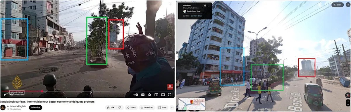 Las tiendas y edificios vistos en el video de Al Jazeera y la foto en Alamy Match Google Street View imágenes Desde un distrito de Dhaka, 180 kilómetros (112 millas) de Khagrachari (enlace archivado).