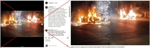 un auto explosión en el corazón de la capital de la India, Delhi, mató al menos a ocho personas e hirió a más de una docena cuando las llamas se extendieron por varios vehículos el 10 de noviembre de 2025. Pero las supuestas imágenes de la explosión que circularon ampliamente en línea no están relacionadas. Una imagen es de un accidente de tráfico ocurrido en abril, mientras que otra muestra un coche bomba mortal en el Líbano hace más de una década.