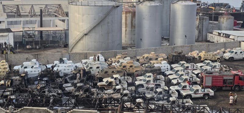 Vehículos militares dañados, que se cree que fueron enviados por los Emiratos Árabes Unidos para apoyar a las fuerzas separatistas del Consejo de Transición del Sur (STC), tras un ataque aéreo de la coalición liderada por Arabia Saudita en el puerto de Mukalla, en el sur de Yemen, el 30 de diciembre de 2025. (crédito: AFP A TRAVÉS DE GETTY IMAGES)