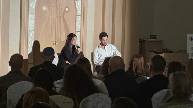 La gente se reunió en la sinagoga con la esperanza de escuchar de primera mano cómo Eliya y Ziv sobrevivieron a los aterradores ataques de Hamas en Israel durante el Festival de Música Nova.