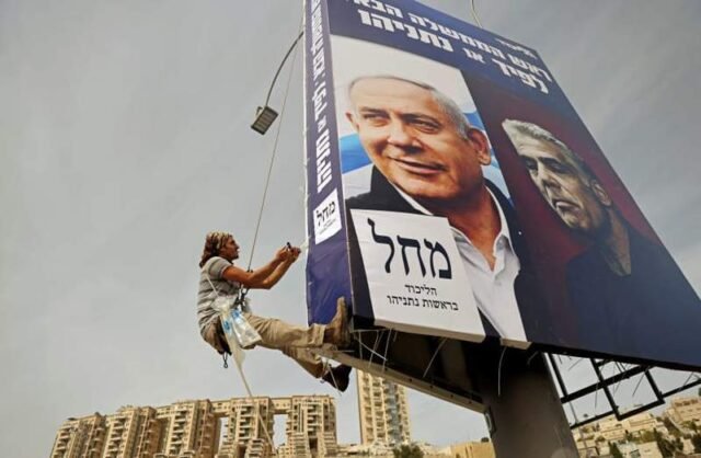 Un hombre cuelga una pancarta electoral del Likud que representa al líder del partido, el primer ministro Benjamín Netanyahu, y a su principal rival, el líder de Yesh Atid, Yair Lapi (crédito: RONEN ZVULUN/REUTERS)