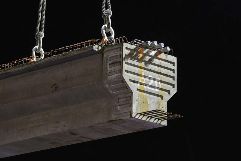 El tramo prefabricado de 41 metros de largo está suspendido de varias grúas y ya se está colocando. (zu dpa: “La guerra en Oriente Medio provoca un aumento de los costes de construcción en Alemania”) Christoph Reichwein/dpa