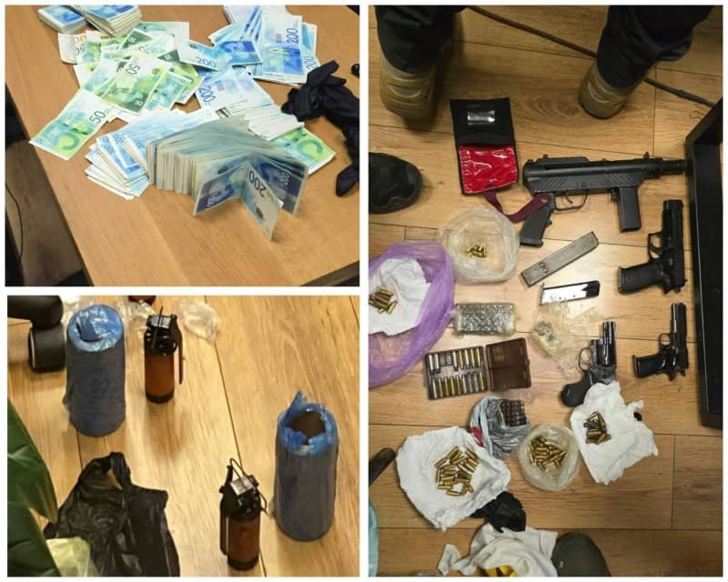Durante la redada, la policía localizó aproximadamente 80.000 shekels en efectivo, así como armas de fuego, granadas paralizantes, explosivos plásticos, municiones y una sustancia sospechosa de ser cocaína.