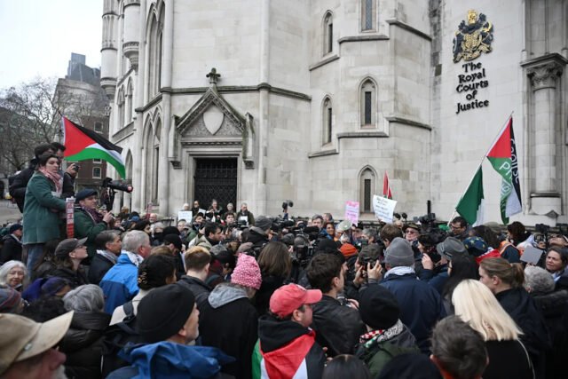 Manifestantes se reúnen frente al Tribunal Superior de Londres durante un fallo sobre la ilegalidad de la prohibición gubernamental de la Acción Palestina, el 13 de febrero de 2026. Crédito: Ben Montgomery—Getty Images