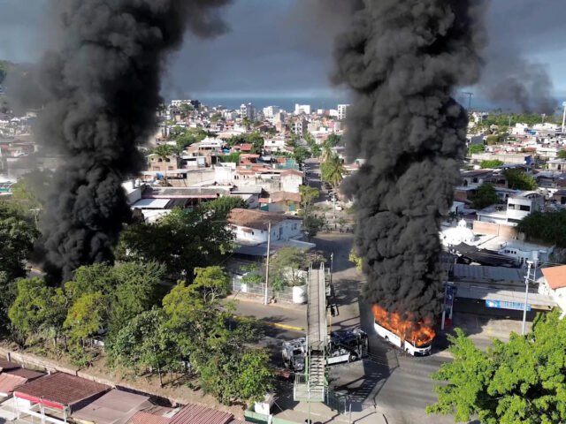 Sale humo de vehículos en llamas que bloquean una carretera en Puerto Vallarta