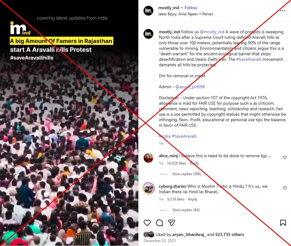 “Una ola de protestas se está extendiendo por el norte de la India después de que un fallo de la Corte Suprema definiera las colinas de Aravalli como aquellas con altura superior a 100 metros, lo que potencialmente dejaría al 90% de la cordillera vulnerable a la minería”, se lee en un artículo de un informe. publicación de instagram compartido el 20 de diciembre de 2025.