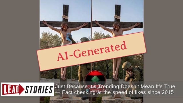 ¿Las fotos reales muestran un Fuerzas de Defensa Israelíes ¿Un soldado reparando y venerando la misma estatua de crucifixión que destrozó? No, eso no es cierto: la IA genera dos imágenes, una que muestra a un soldado lavando la estatua y la otra a un soldado arrodillado al pie de la cruz. Google Gemini identificó las fotos por tener una marca de agua SynthID. Las imágenes falsas comenzaron a circular después de que una imagen real de un soldado de las Fuerzas de Defensa de Israel (FDI) destrozando el monumento cristiano se volviera viral. El acto de vandalismo fue real y fue condenado por el Primer Ministro israelí Netanyahu.
