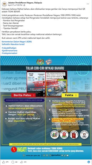 A búsqueda de palabras clave En Google, el Departamento de Registro Nacional de Malasia (JPN) calificó las acusaciones de “falsas” en una declaración del 17 de abril. publicación en facebook (enlace archivado).