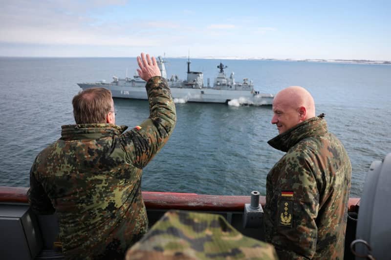 Boris Pistorius (centro), ministro de Defensa alemán, cruza la plataforma de aterrizaje a bordo del buque de desembarco español