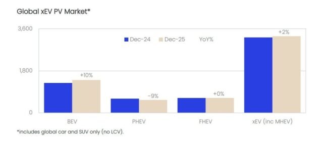A pesar de las ventas de BEV de vehículos de pasajeros (PV – automóvil) inferiores a las esperadas en China, el total global de PV BEV en diciembre fue la cifra mensual más alta de 2025.