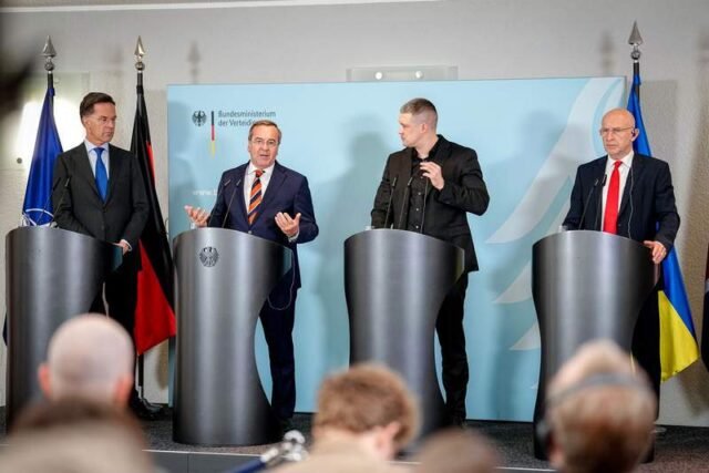 (De izquierda a derecha) El Secretario General de la OTAN, Mark Rutte, el Ministro de Defensa alemán, Boris Pistorius, el Ministro de Defensa ucraniano, Mykhailo Fedorov, y el Ministro de Defensa británico, John Healey, dan una conferencia de prensa después de la reunión del Grupo de Contacto de Ucrania en el Ministerio Federal de Defensa. Kay Nietfeld/dpa
