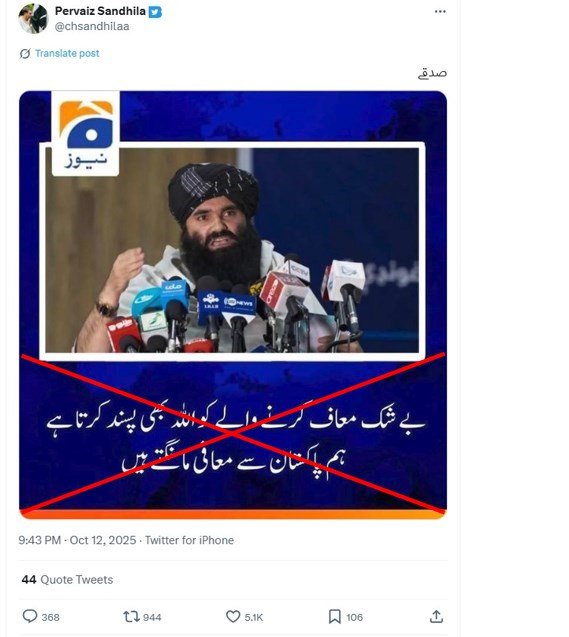 Un alto el fuego puso fin a escaramuzas transfronterizas mortales entre Afganistán y Pakistán que dejaron decenas de muertos en octubre, pero las afirmaciones en línea de que el gobierno talibán en Kabul ha pedido perdón a Islamabad son infundadas. Las publicaciones falsas, que han circulado ampliamente entre los usuarios de las redes sociales paquistaníes, presentan una historia falsa.