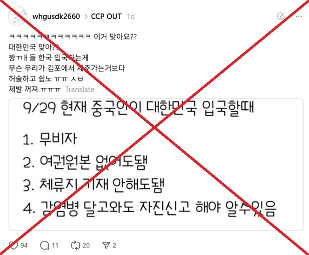 Después de que Corea del Sur otorgó una entrada sin visa a grupos de viajes chinos a fines de septiembre de 2025, las publicaciones en redes sociales en idioma coreano afirmaron falsamente que todos los ciudadanos chinos ya no estaban sujetos a requisitos de inmigración, como pasaportes o informes sobre enfermedades. Sin embargo, las nuevas reglas de viaje solo se aplican a los ciudadanos chinos que van a Corea del Sur con agencias de viajes previamente aprobadas, y los pasaportes permanecen OBLIGATORIO.