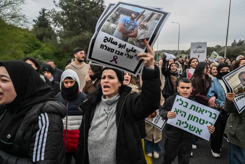 Miembros de la comunidad árabe de Israel protestan contra la violencia en su comunidad, en Sakhnin, norte de Israel, el 22 de enero de 2026. (Crédito: MICHAEL GILADI/FLASH90)