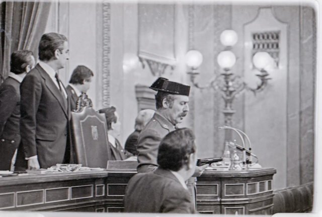 Tejero gritó “¡Todos, quietos!” ” mientras blandía una pistola mientras tomaba el Parlamento, luciendo el sombrero tricornio de charol de la Gendarmería de la Guardia Civil española. Los atacantes interrumpieron la votación de la Cámara para tomar juramento a Leopoldo Calvo-Sotelo como Primer Ministro español.
