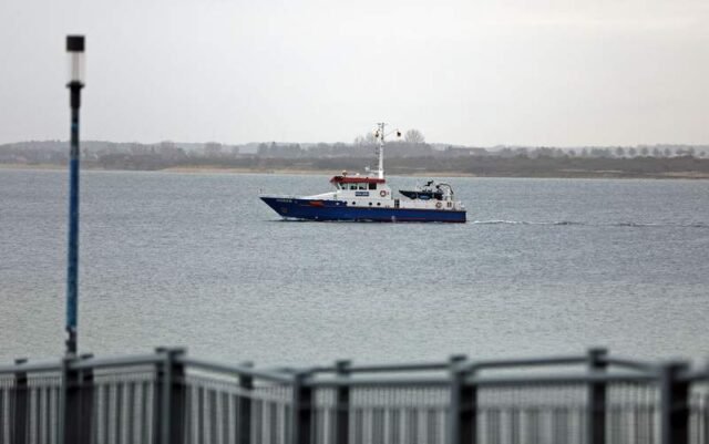 Un barco policial navega en la bahía de Wismar. La ballena jorobada, que fue liberada en Timmendorfer Strand y quedó varada nuevamente en un banco de arena en la bahía de Wismar, se encuentra actualmente sumergida. Stefan Trétropp/dpa