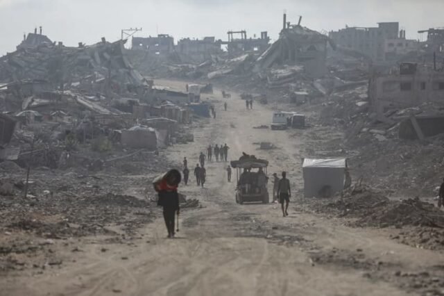 Los palestinos inspeccionan edificios muy dañados, algunos de los cuales quedaron completamente destruidos, y recogen artículos utilizables en el campo de refugiados de Nuseirat después de que las fuerzas israelíes atacaran el centro de Gaza, violando el alto el fuego. El ejército israelí ha matado a 63 palestinos, incluidos 24 niños, en la Franja de Gaza desde el martes 28 de octubre por la tarde. Belal Abu Amer/APA Images via ZUMA Press Wire/dpa