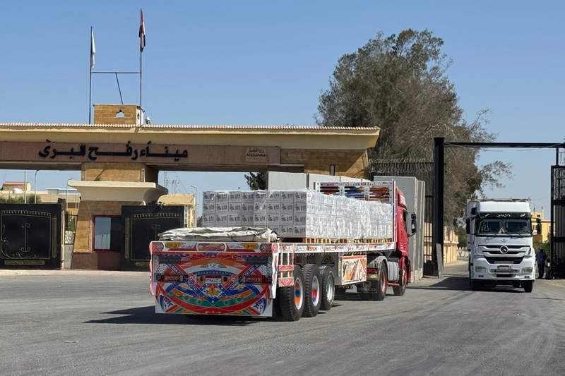 Una vista muestra un cartel mientras camiones que transportan ayuda (no en la foto) esperan en el lado israelí del cruce fronterizo de Kerem Shalom hacia el sur de Gaza, el 20 de octubre de 2025. (Crédito: REUTERS/HANNAH MCKAY)