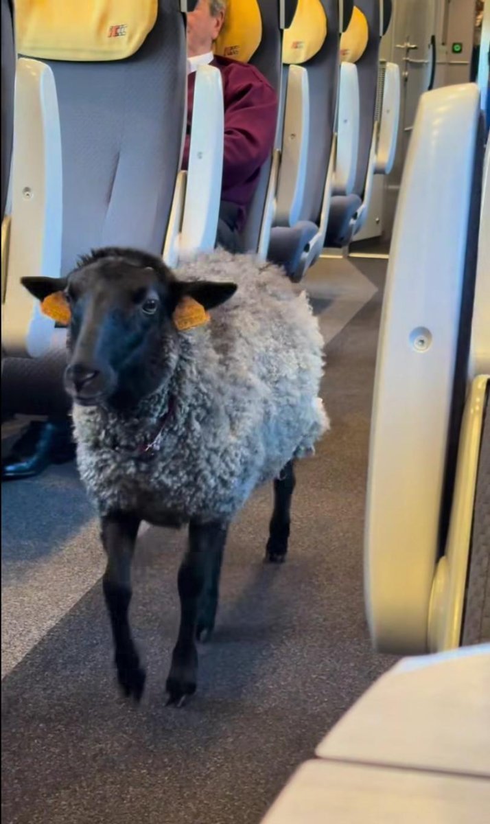 El vídeo muestra una oveja, vestida con un pañal, caminando por el pasillo del tren entre los asientos.