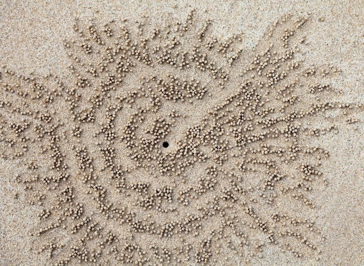 Lo que dejan atrás parece diseñado deliberadamente: delicados rayos de sol, espirales y líneas radiantes formadas por miles de diminutas bolas de arena. Sin embargo, esto no es arte por el arte: es el resultado del hambre, la eficiencia y el instinto expresado con precisión matemática.
