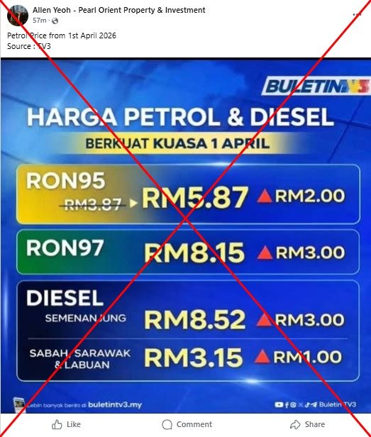 Los crecientes precios del combustible causados por la guerra en el Medio Oriente tienen a muchos malayos preocupados por pagar más en el surtidor, pero las publicaciones en las redes sociales que afirman que los precios de la gasolina aumentarán drásticamente en realidad comparten gráficos inventados. La emisora local TV3 y el Ministerio de Finanzas negaron haber publicado los gráficos circulantes, que muestran precios inexactos de la gasolina y el diésel.